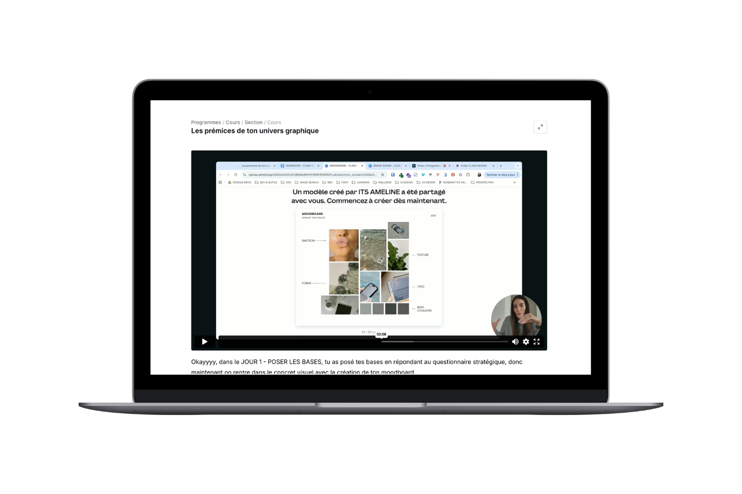 Non. FLASH DESIGN n’est pas un cours de création de logo ni une prestation de graphiste. À la fin, tu auras une palette, des typos, un moodboard, un brand book et une cohérence visuelle claire pour ton business.